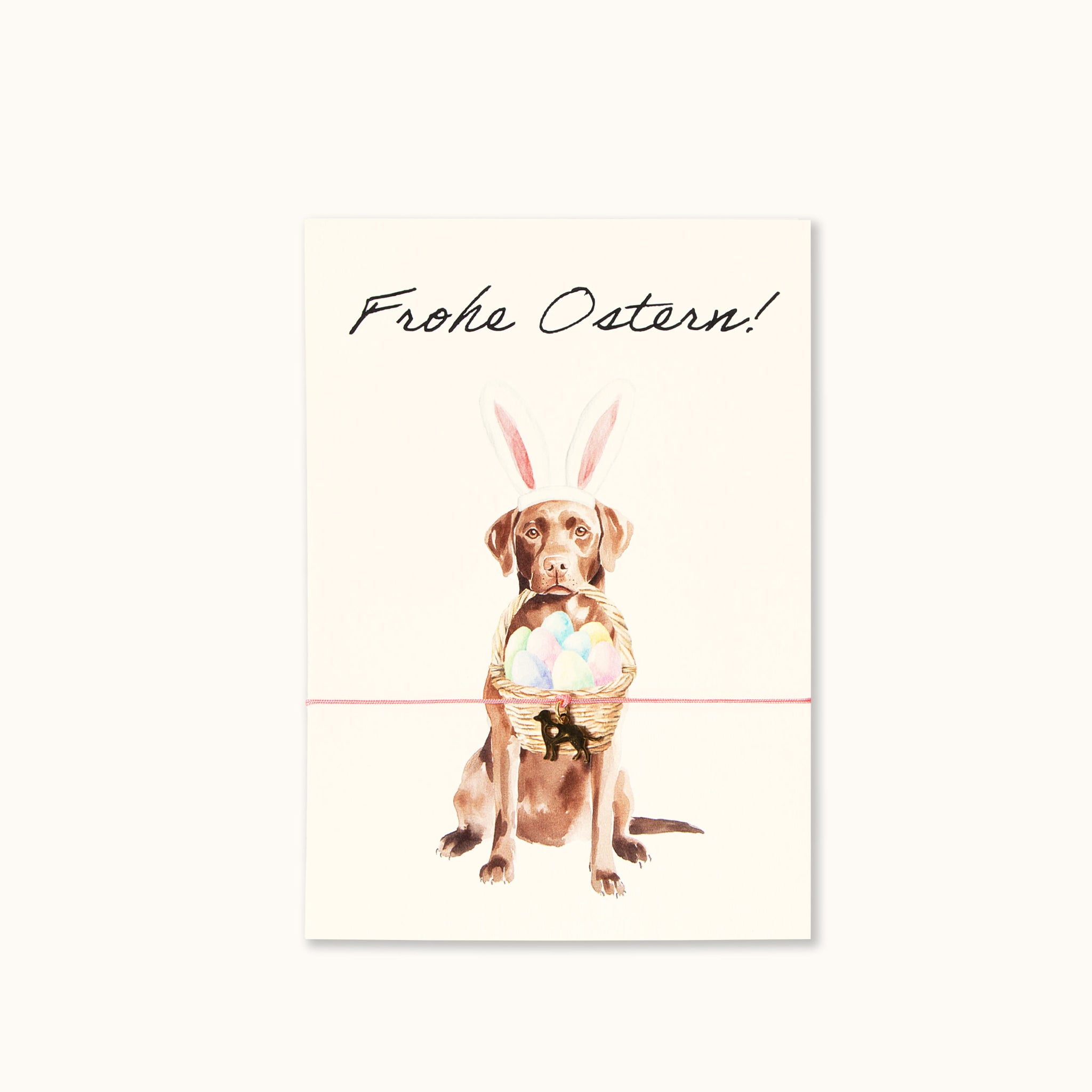 Die perfekte Karte für Labrador-Liebhaber zu Ostern. Ein süßer Labrador mit einem Körbchen voller Ostereier im Maul, und ein Armband mit einem Labrador-Anhänger an einem korallenfarbenen Band.