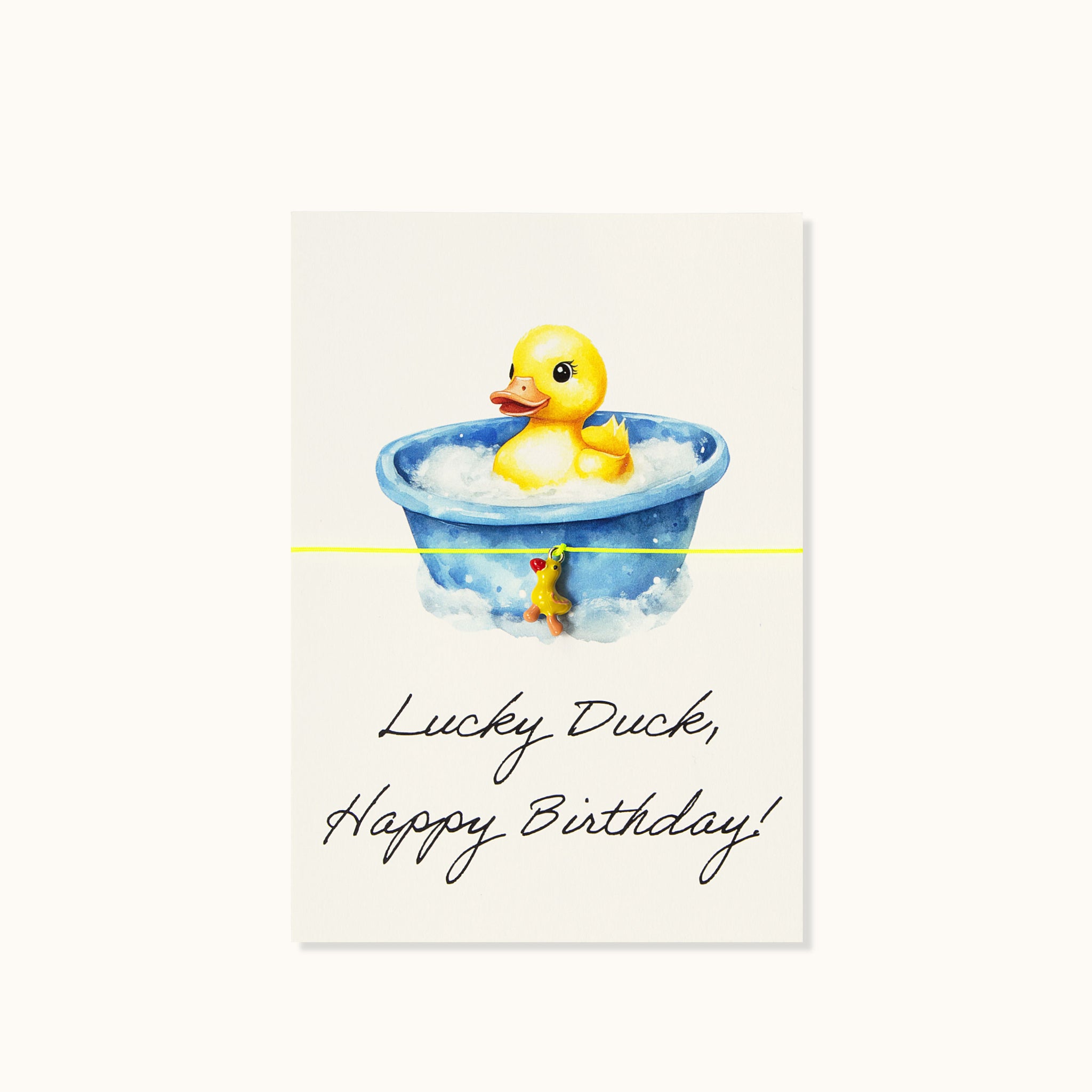 Die perfekte Geburtstagskarte für kleine Glücksbringer! Armband mit einem Anhänger in Form eines süßen Gummienten an einem neon-gelben Band. Denn ein fröhlicher Begleiter macht jeden Geburtstag noch lustiger! 🦆🎉