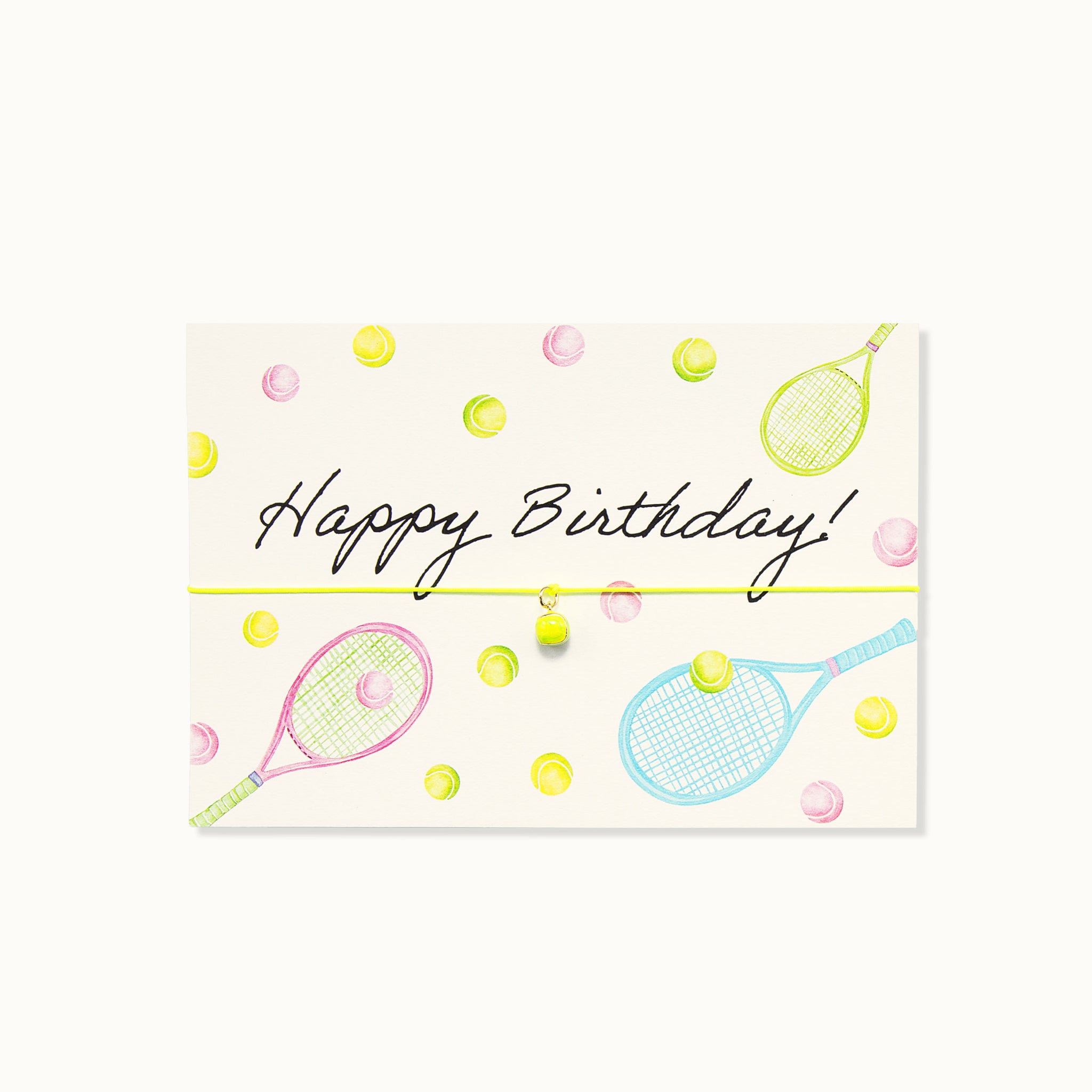 Die perfekte Karte für Tennisfans. Armband mit einem Anhänger in Form eines Tennisballs an einem neon-gelben Band.
