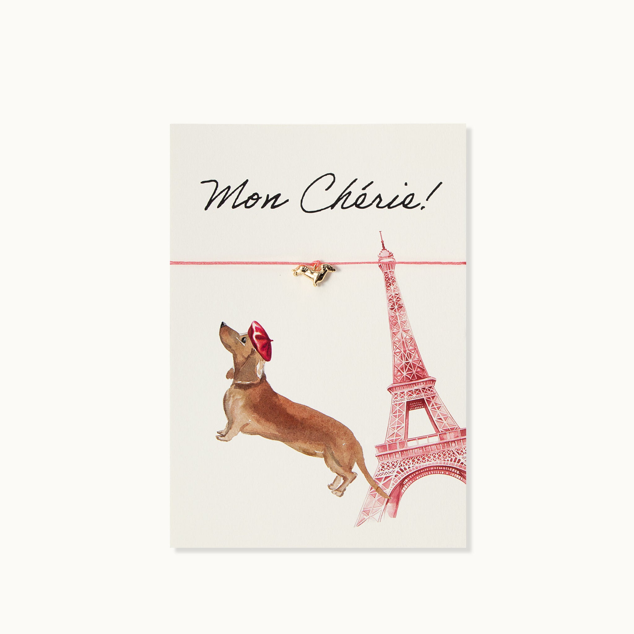 Die perfekte Karte für Frankreich-Liebhaber. Armband mit einem Anhänger in Form eines Dackels an einem korallfarbenen Band, mit einem kleinen Hinweis auf den Eiffelturm.
