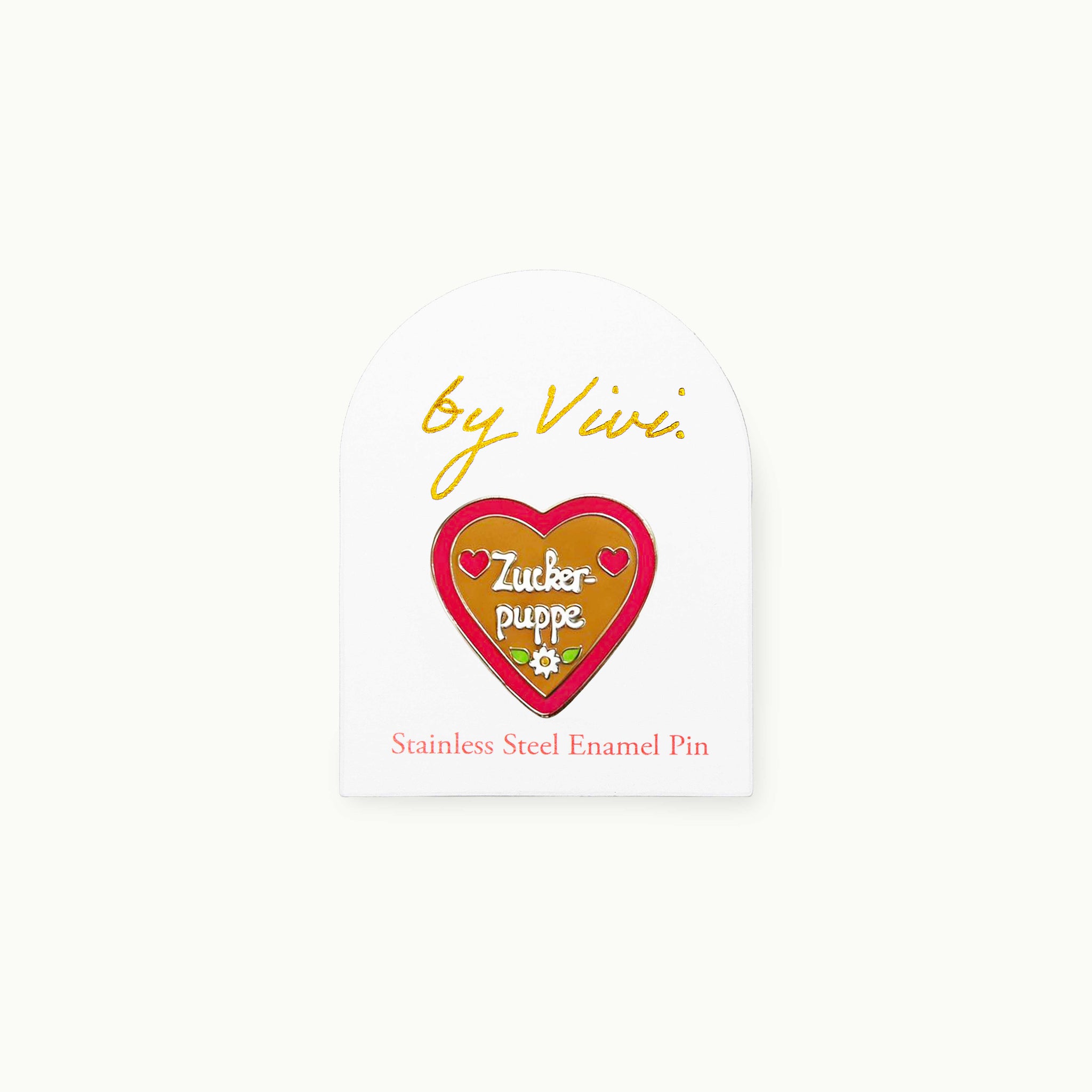 Ansteckpin aus Metall und Emaille in Form eines Lebkuchenherzens mit der Aufschrift „Zuckerpuppe“.